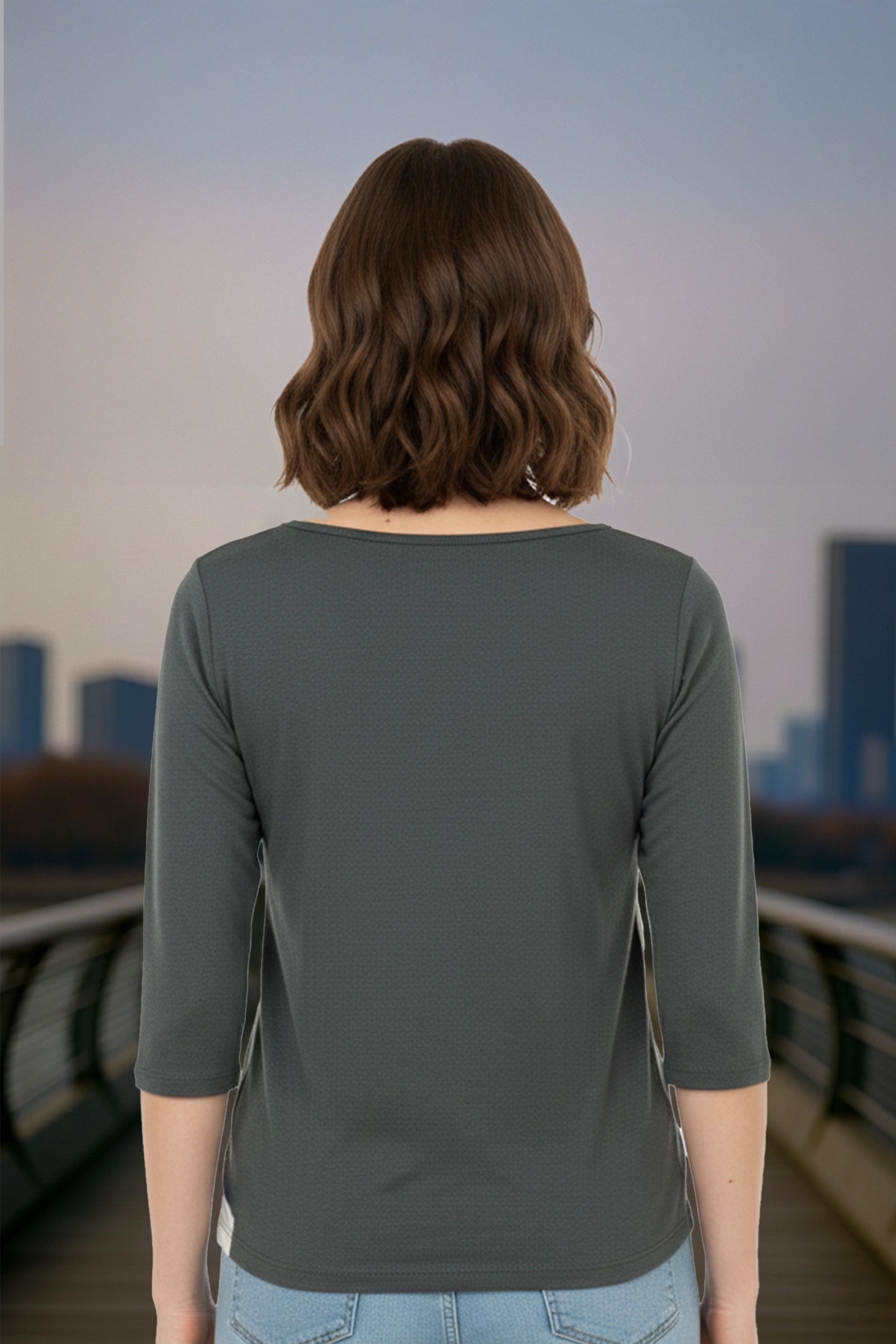 Grey Top With White and Light Green Line Women T-Shirt