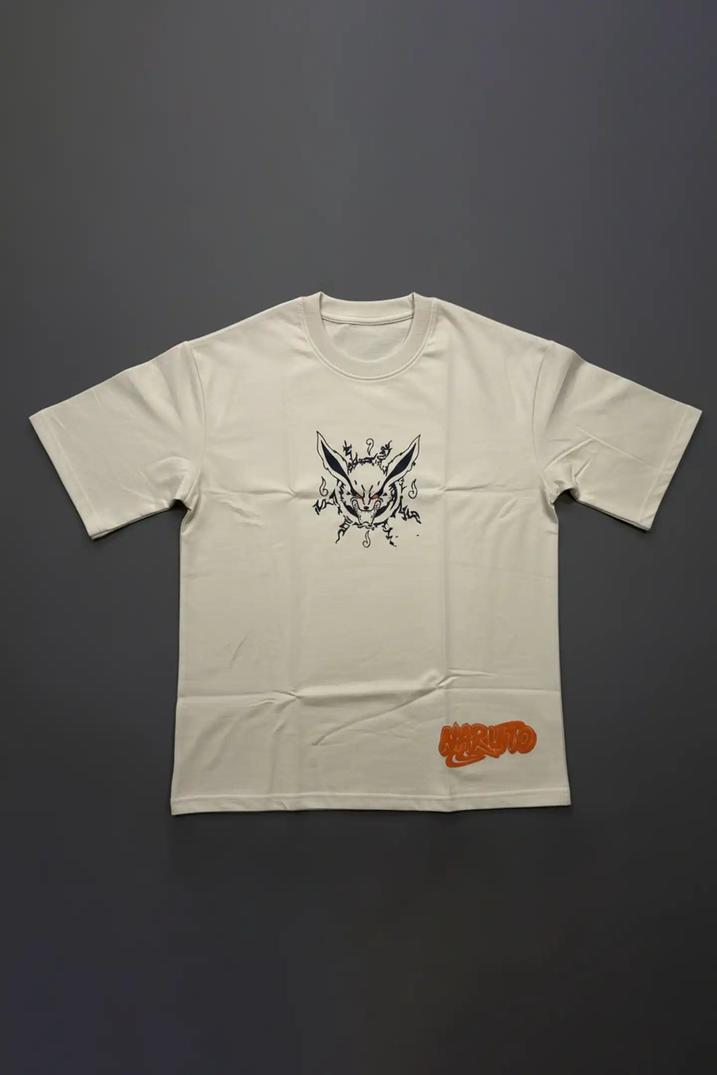 This cream-colored T-shirt features a powerful anime-inspired design with intense eyes, bright orange spiky hair, and dramatic black chain elements that create a strong visual impact. The orange accents stand out beautifully against the light base, giving the shirt a bold and energetic vibe.