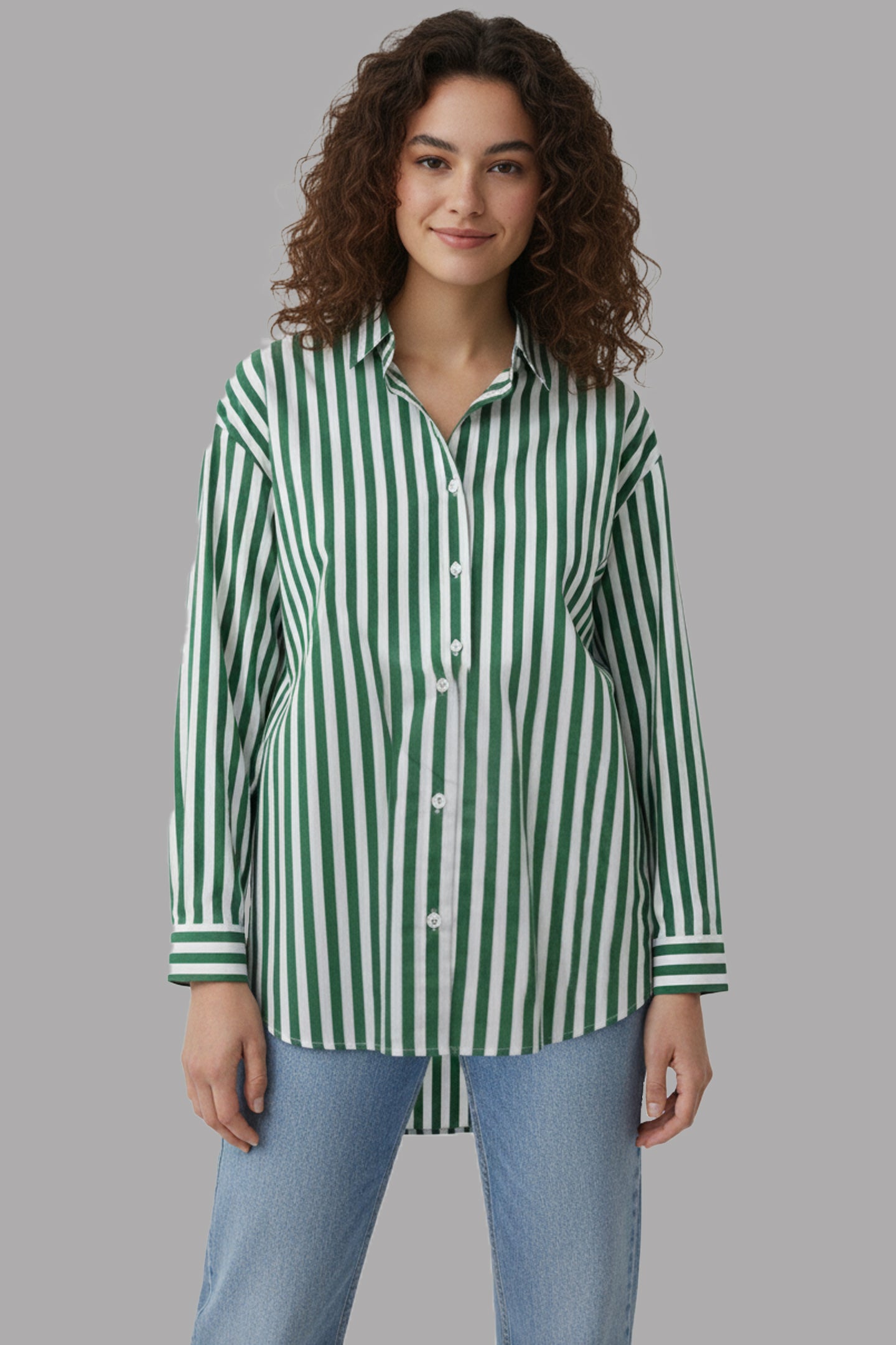 "Meet your new favorite statement piece: The Evergreen Stripe Button-Down. This classic shirt is designed with a striking pattern of bold emerald green and crisp white vertical stripes, making it a standout addition to any wardrobe.
