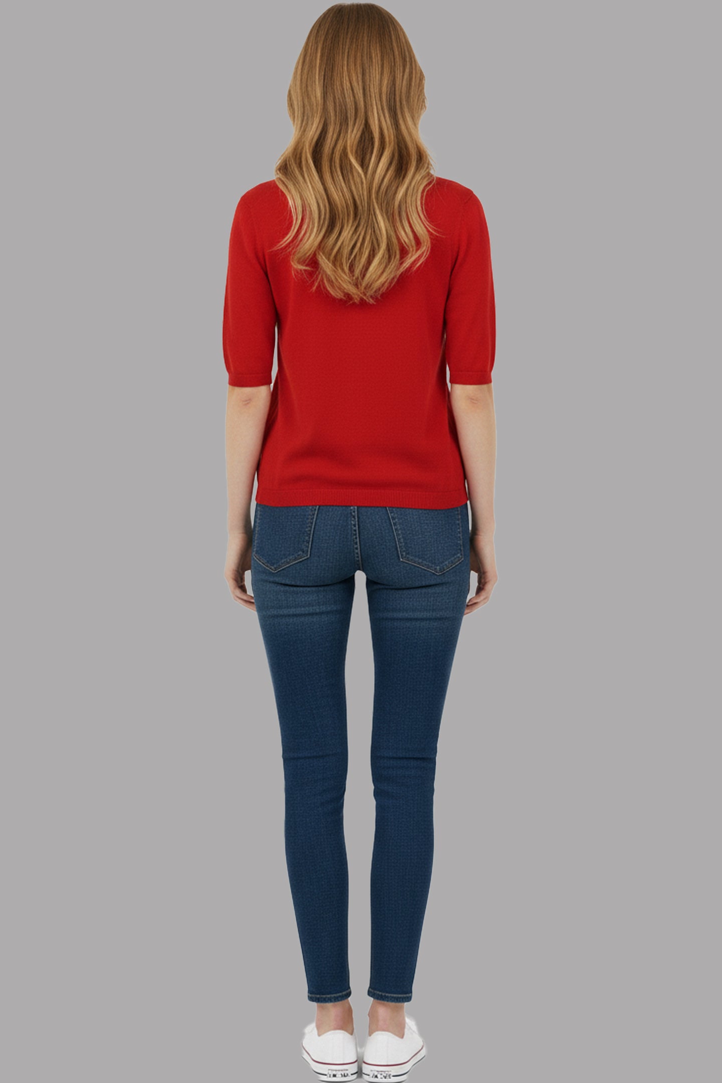 "Add a vibrant pop of color to your wardrobe with our Ruby Red Short Sleeve Cardigan. This top is the perfect versatile piece, blending the comfort of a lightweight knit sweater with the ease of a casual button-up blouse.